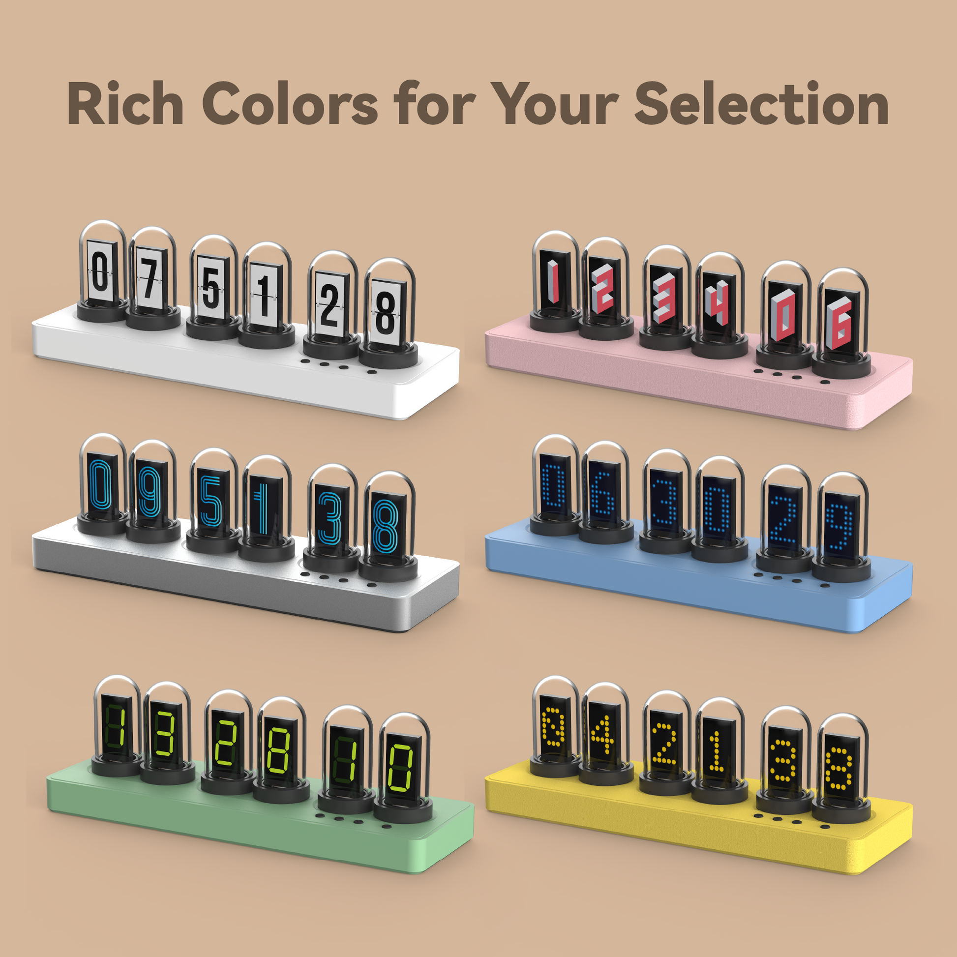 - Simulated Nixie Tube Alarm Clock: features 6 pieces of 0.96-inch IPS screens, a base made of ABS, and a quartz glass cover for dust protection. It supports WIFI time synchronization and is equipped with a 5V 1A Type-C power interface, which can be conveniently charged through a mobile phone charger or computer